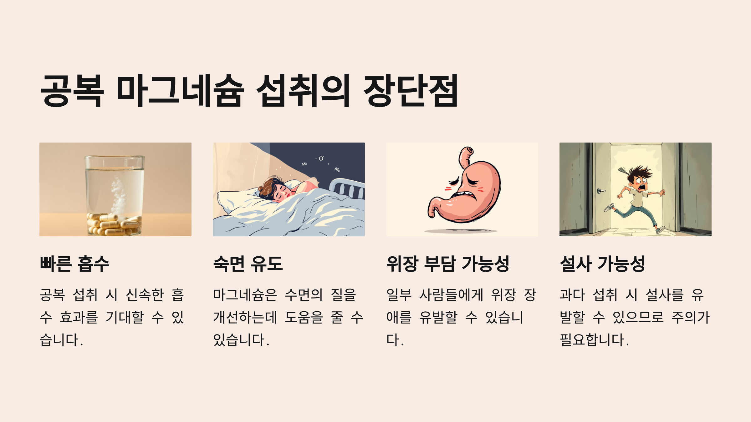 - 숙면 유도: 잠들기 전 공복에 마그네슘을 복용하면 근육 이완과 신경 안정 효과가 더 빨리 나타나 숙면에 도움을 줄 수 있습니다.