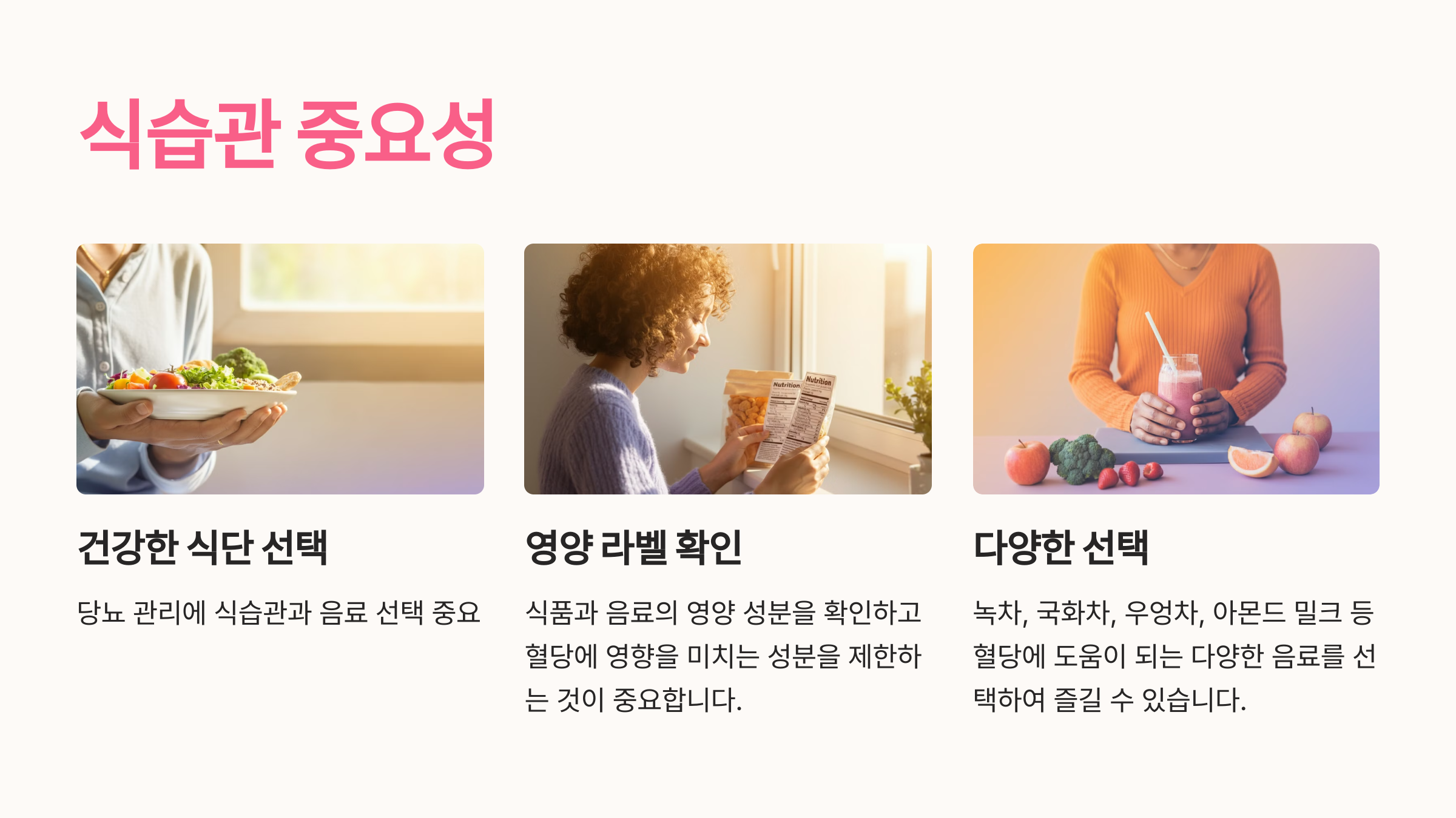 당뇨 관리에 있어 중요한 것은 바로 식습관과 음료 선택입니다. 녹차, 국화차, 우엉차와 같은 차는 혈당 조절에 도움을 주며, 아몬드 밀크나 사과식초 음료와 같은 대체 음료 역시 당뇨 관리에 도움이 될 수 있습니다. 특히, 이러한 음료들은 당뇨 환자뿐만 아니라 건강한 식생활을 원하는 사람들에게도 좋은 선택입니다. 혈당 수치를 잘 관리하고, 지속 가능한 건강을 위해 이번 가이드를 참고하여 나만의 건강한 음료 습관을 만들어 보세요! 😊