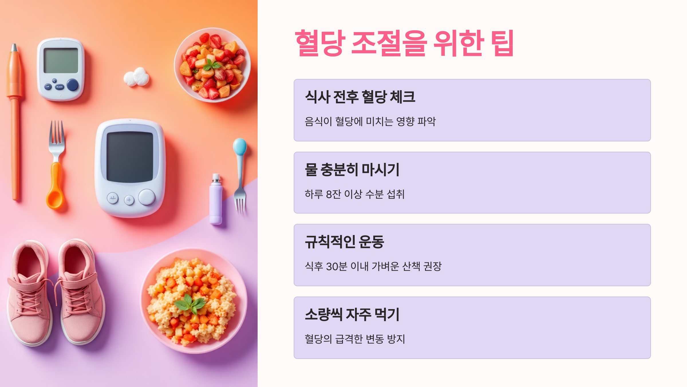 한 번에 많은 양을 먹기보다는 소량을 여러 번 나눠 먹는 것이 혈당 관리에 유리합니다. 이를 통해 혈당의 급격한 변동을 막을 수 있습니다.