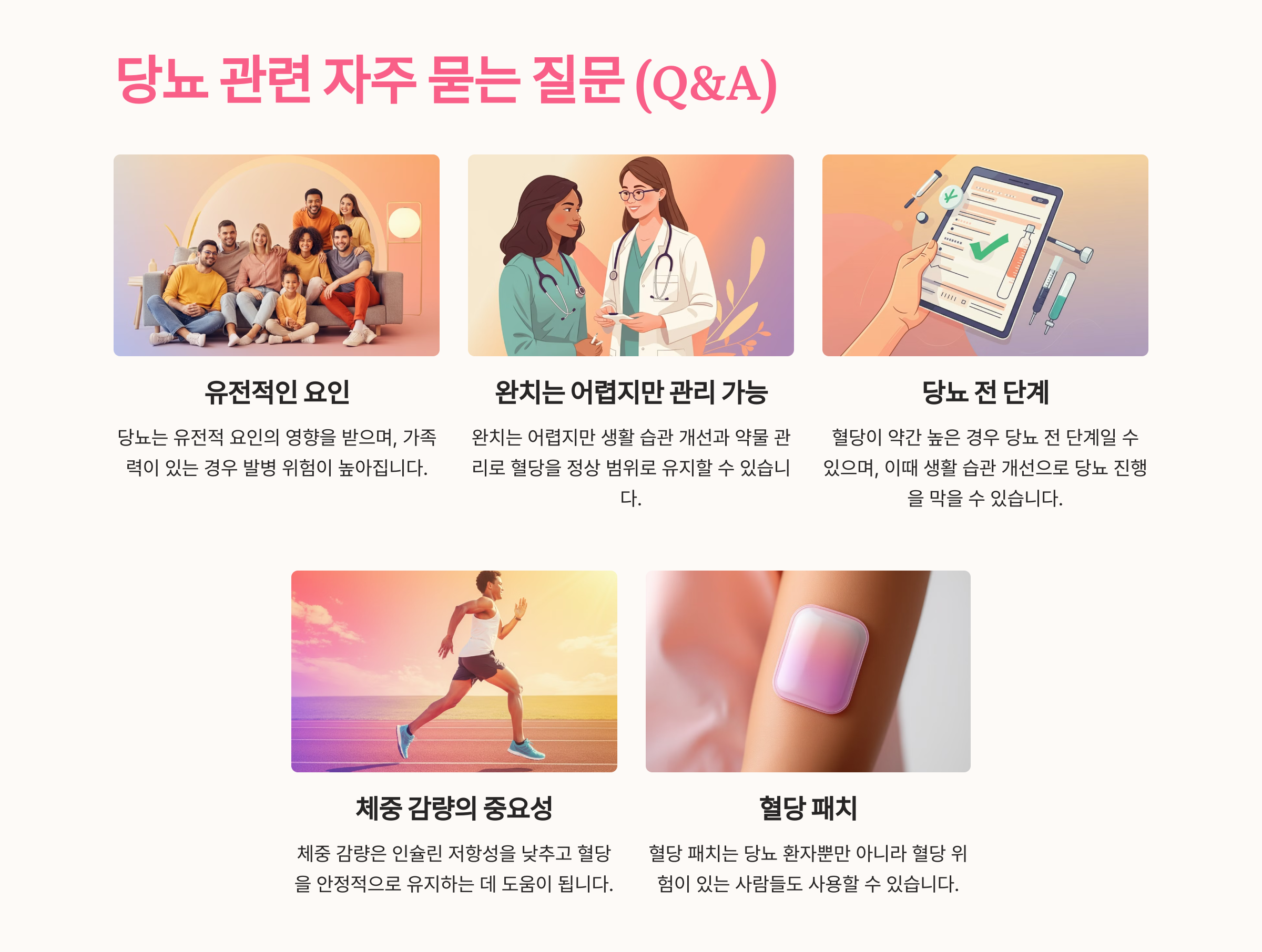 A2. 현재로서는 완치가 어렵지만, 생활 습관 개선과 적절한 약물 관리로 혈당을 정상 범위로 유지할 수 있습니다. 조기 관리와 치료로 합병증 발생을 최소화할 수 있습니다.