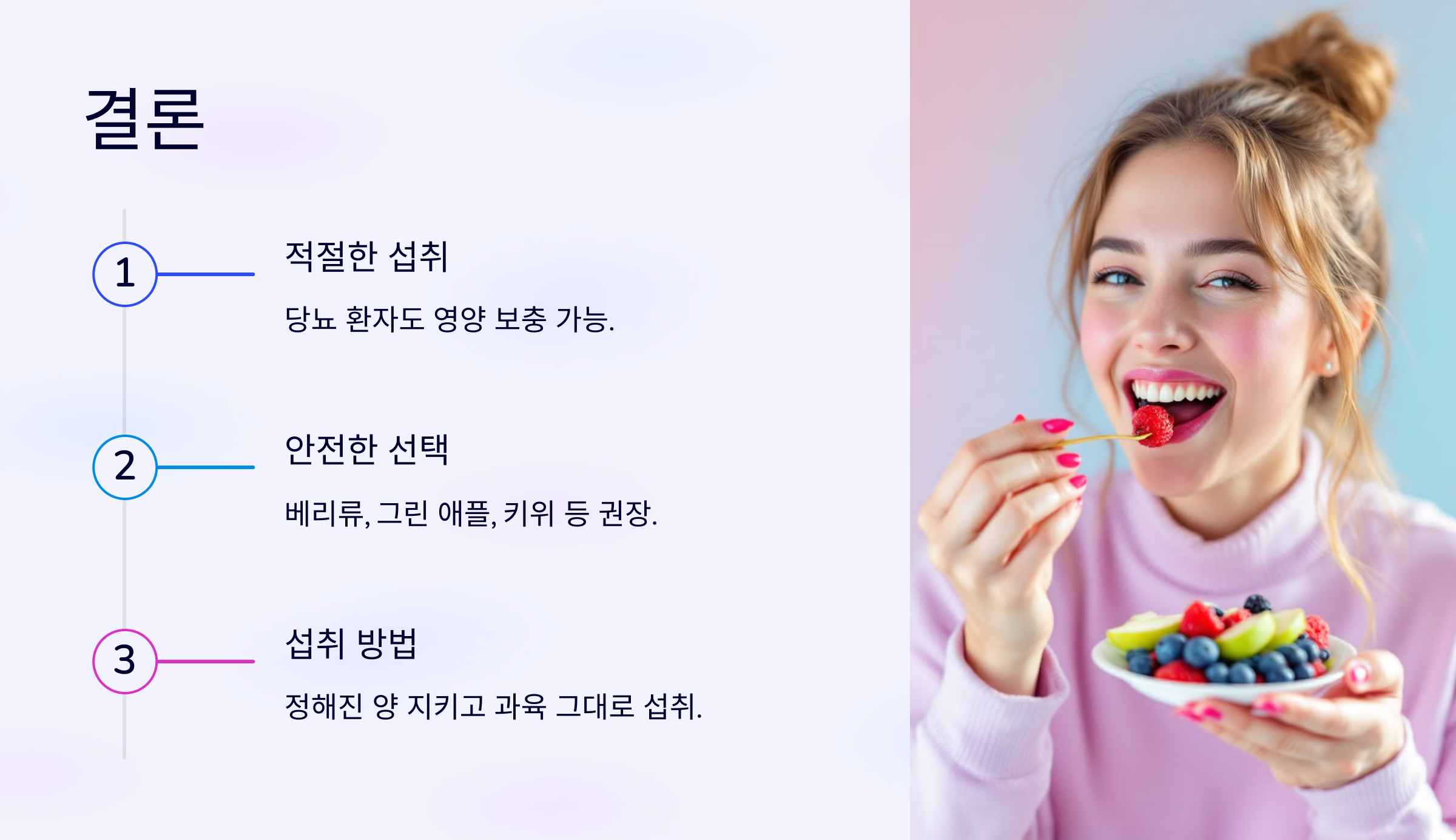 - 과일은 비타민과 미네랄, 항산화 물질이 풍부해 적당히 섭취하는 것이 좋습니다.
