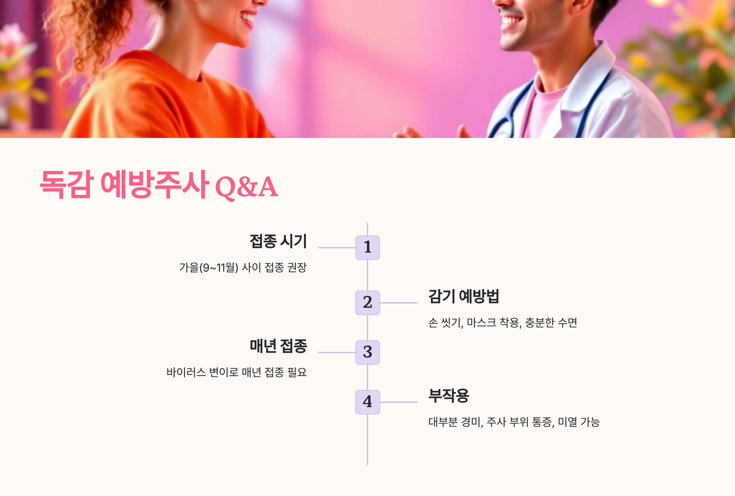 독감은 단순한 감기와 달리 고열, 극심한 피로, 호흡 곤란 등의 심각한 증상을 동반할 수 있으며, 폐렴과 같은 합병증을 일으킬 가능성이 큽니다. 특히 노약자, 어린이, 만성질환자에게 위험한데요. 독감 예방주사를 통해 독감을 예방하면 자신뿐만 아니라 주변 사람들의 건강까지 지킬 수 있습니다.