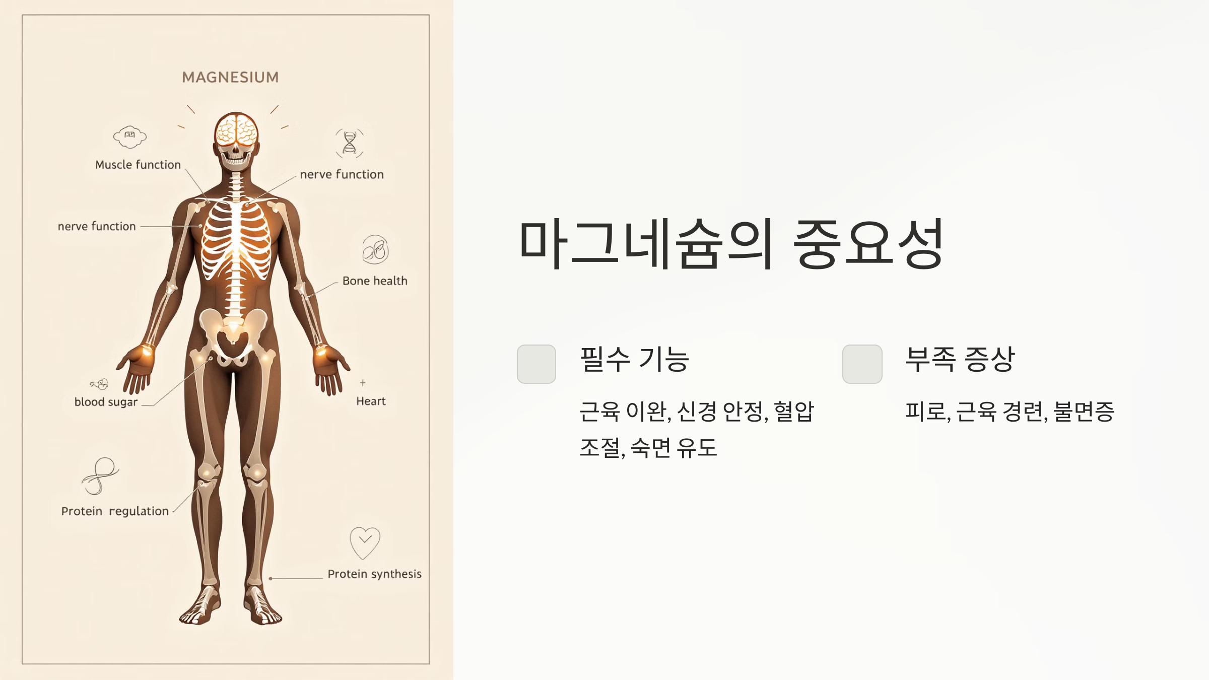 현대인의 식단은 스트레스와 불규칙한 생활습관으로 인해 마그네슘 부족 현상을 겪는 경우가 많습니다. 마그네슘은 근육 이완, 신경 안정, 혈압 조절, 숙면 유도와 같은 다양한 기능을 담당하는 필수 미네랄인데요. 부족할 경우 피로, 근육 경련, 불면증 등 여러 증상이 나타날 수 있습니다.