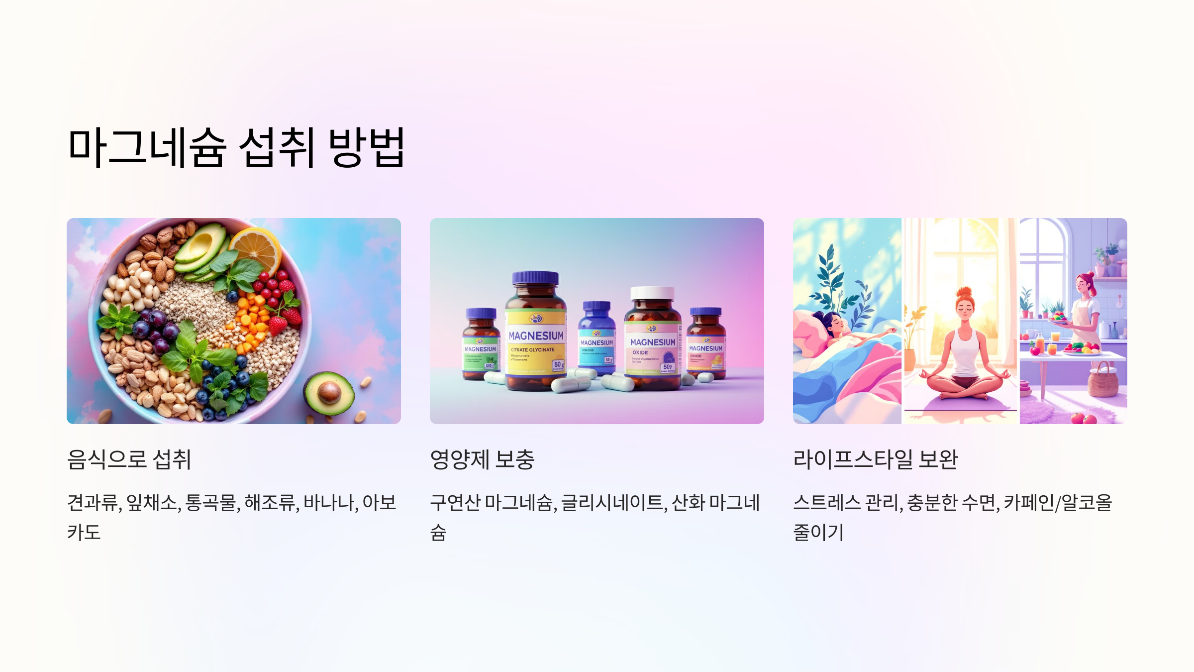 - 충분한 수면: 잠을 잘 자야 마그네슘이 몸에서 제대로 활용됩니다.