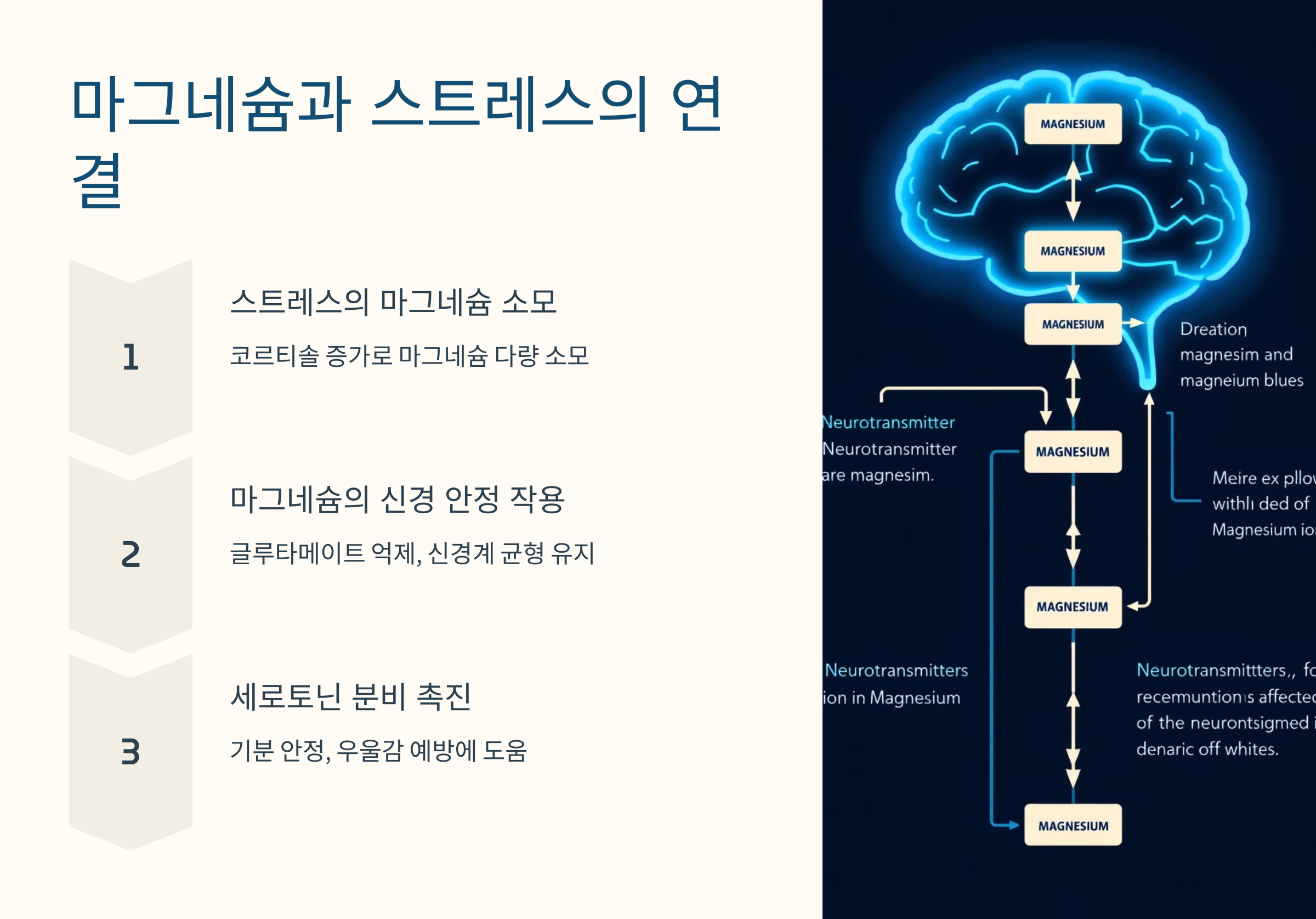 - 작용 원리: 스트레스 상황에서는 코르티솔(스트레스 호르몬)이 증가하며, 이 과정에서 마그네슘이 다량 소모됩니다.