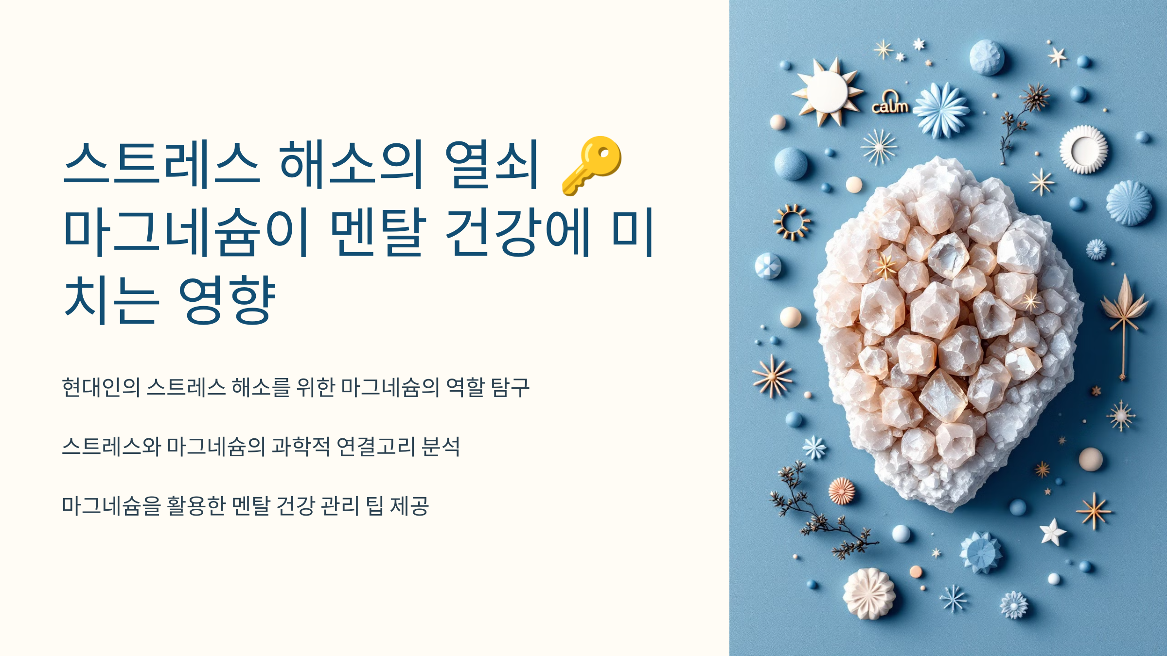 현대인은 스트레스를 안고 살아갑니다. 시험, 업무, 인간관계 등 일상 속에서 쌓이는 스트레스는 몸과 마음을 무겁게 만들죠. 그런데 여기, 마그네슘이라는 작은 미네랄이 스트레스를 완화하고 멘탈 건강을 지키는 데 큰 역할을 한다는 사실, 알고 계셨나요?