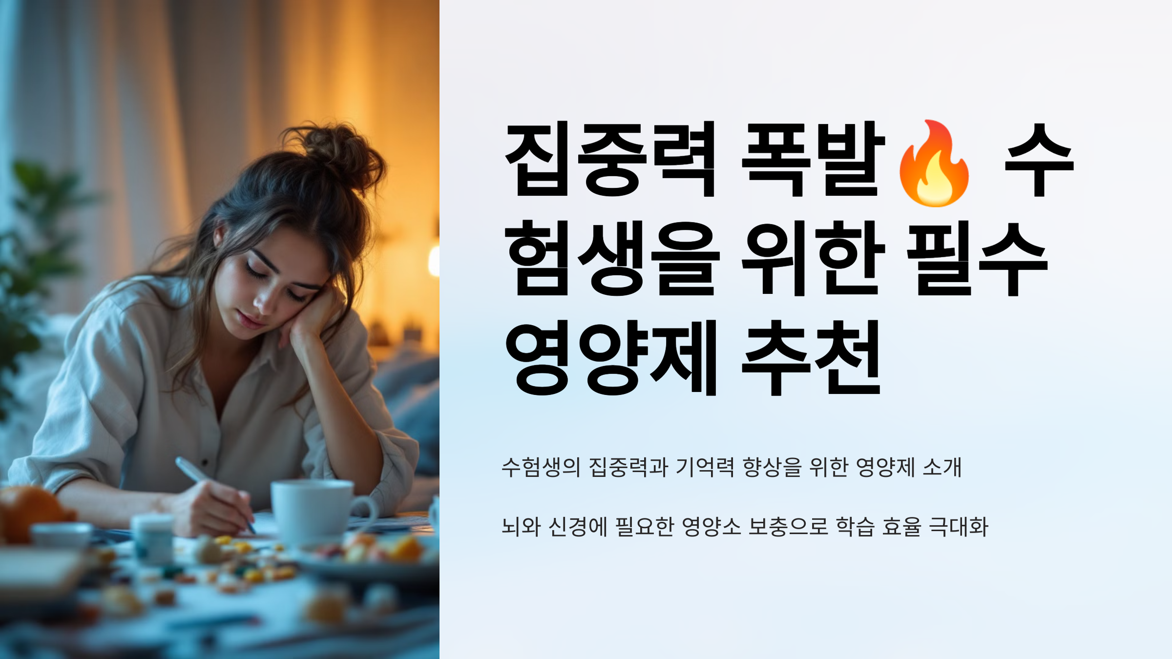 오늘은 수험생들의 학습 효율을 극대화할 수 있는 영양제를 소개합니다. 몸과 머리, 그리고 마음까지 케어해 줄 수 있는 아이템들을 지금부터 확인해 보세요! 🚀