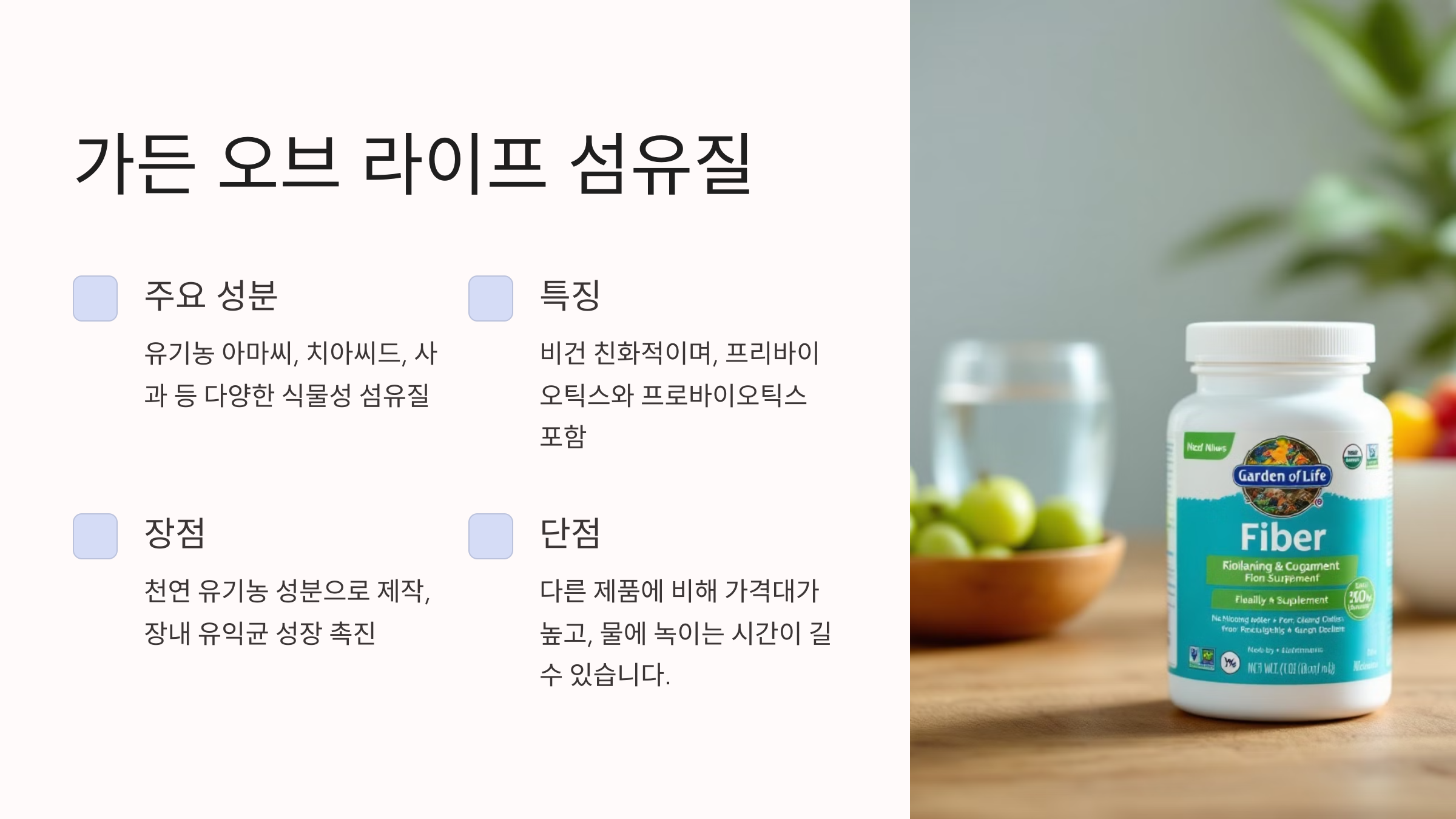 - 적합 대상: 섬유질이 풍부한 보충제를 일상에 섞어 먹고 싶은 사람
