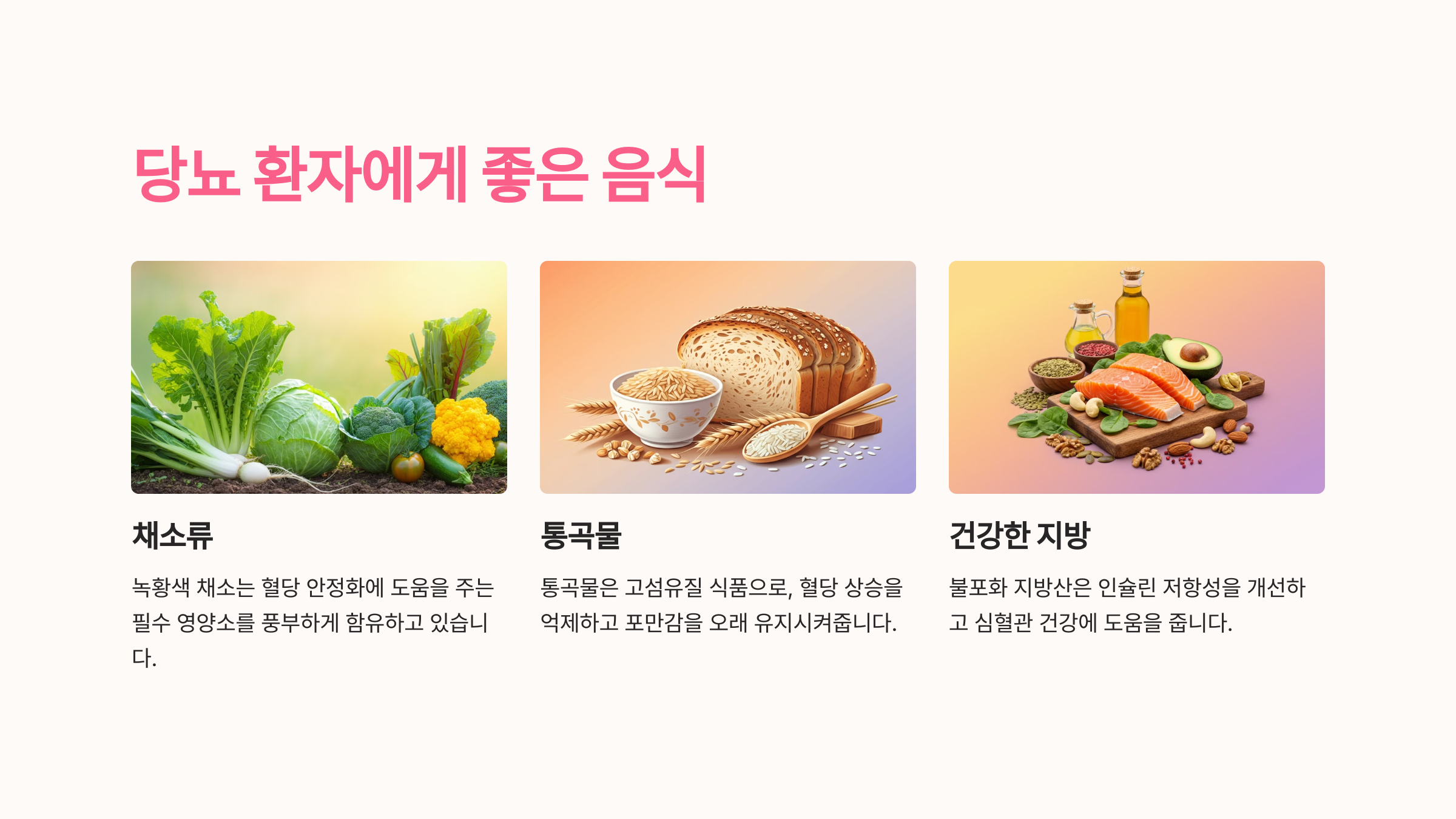당뇨병은 체내 혈당 조절에 영향을 주는 질환으로, 적절한 식단 관리가 필수적입니다. 올바른 음식 선택은 혈당을 안정시키고 건강을 유지하는 데 큰 도움이 되죠. 이 글에서는 당뇨 환자에게 추천되는 음식과 피해야 할 음식을 한눈에 쉽게 확인할 수 있도록 정리했습니다. 매일 식사할 때 건강한 선택을 돕기 위해 실질적인 정보를 제공하겠습니다.